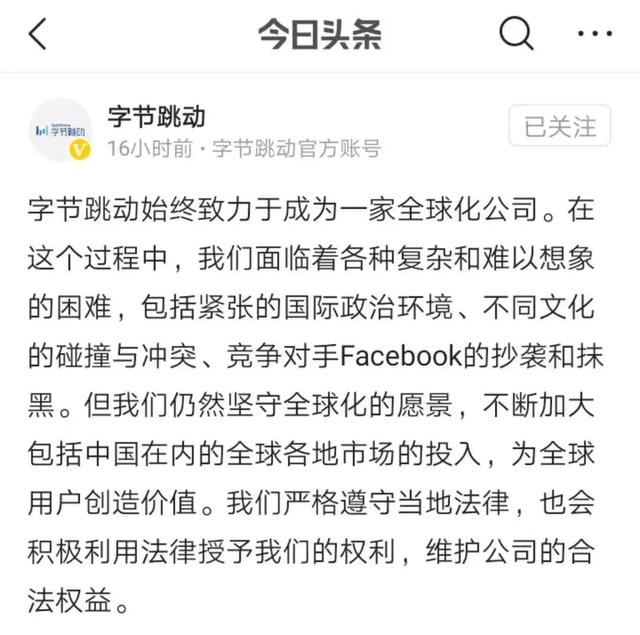 8月2日深夜,字节跳动在其今日头条官方账号上发布了一条声明,称面对紧张的国际政治环境和竞争对手Facebook的抄袭抹黑,仍然坚持全球化愿景,并强调字节跳动严格遵守当地法律,“也会积极利用法律授予我们的权利,维护公司的合法权益。”
