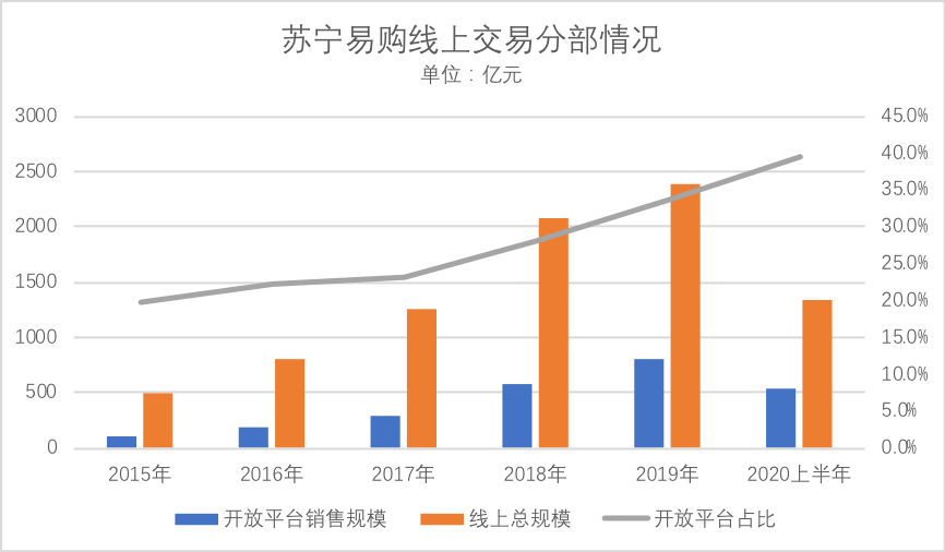 强化线上平台的主动性之后,使苏宁易购的线上成长推动力转为自有平台内的开放生态,提高了平台的成长性和持久性。