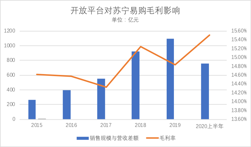 作为以自营模式起家的零售企业,最初苏宁易购的总营收几乎等同于平台交易额,随着线上和线下开放战略的推进,平台交易额会逐渐大过总营收,且差额会越来越大,我们不妨用此差额来表示线上和线下开放平台的交易趋势走向。