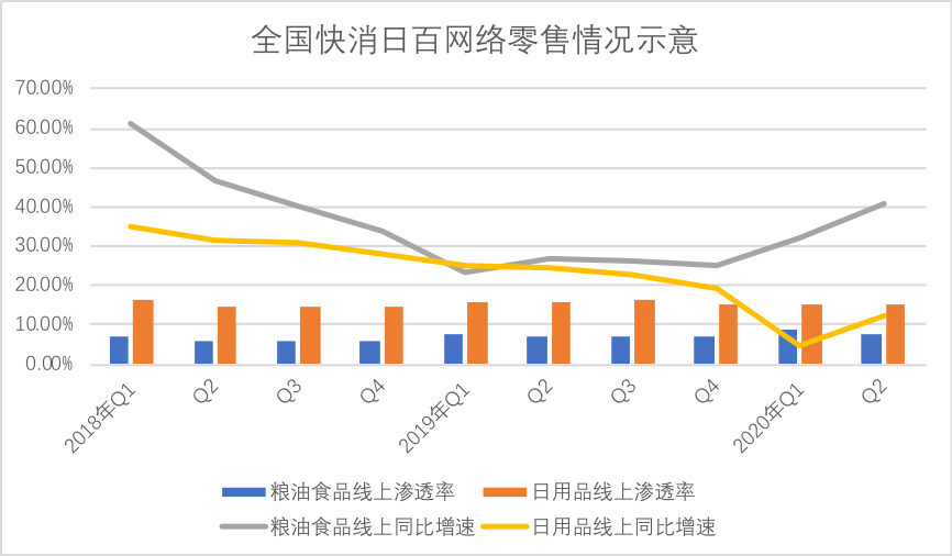 2020上半年,即使在疫情带动线上化的大背景下,两大品类的线上渗透率依然在20%上下,不足服装一个品类。且作为生活刚需品类这又是一个尚未被充分挖掘的蓝海市场,线上渗透率在过去10个季度的胶着和萎靡不前,也证实了日百快消品类对线下渠道的依赖。