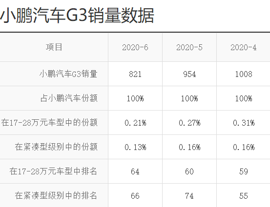 据乘联会数据显示,2020年上半年小鹏G3销量为4202辆,同比下滑56.2%,更为糟糕的是4~6月的销量呈现逐月下滑的趋势,倘若趋势不改恐难以达到2019年全年销量16608辆的高度。