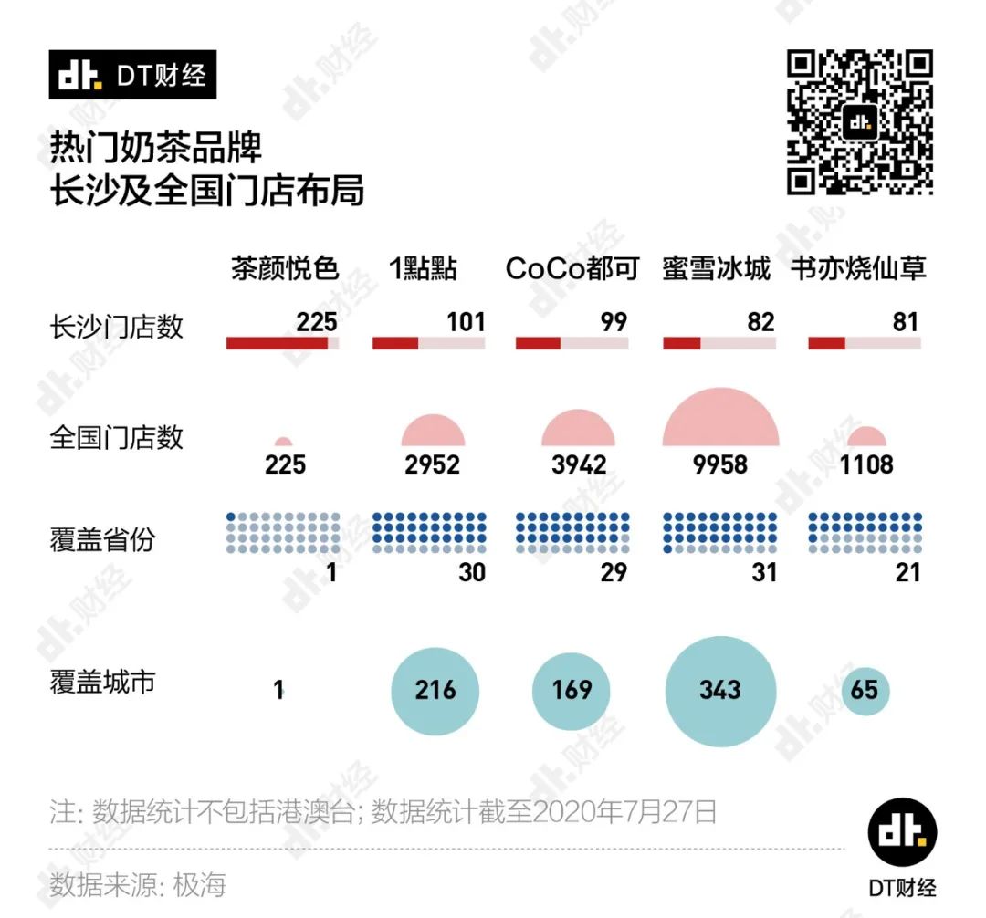 单从门店数量来看,截至2020年7月27日,茶颜悦色在长沙有225家门店,是CoCo和1點點的2.2倍,书亦烧仙草和蜜雪冰城的2.7倍。