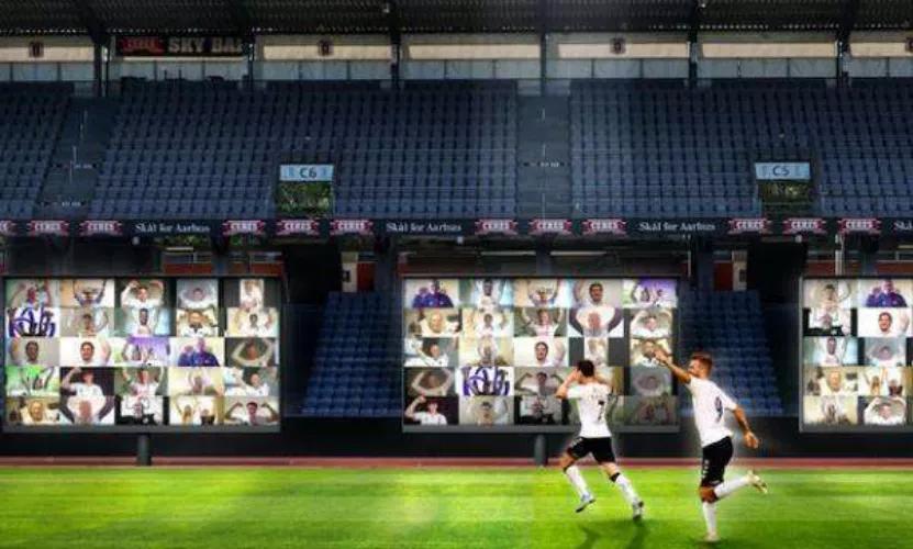 另外一种能够增强现场观赛氛围的方式,就更显一些“技术含量”了。在5月份,丹麦超级联赛重启时,奥尔胡斯俱乐部在球场放置了几个巨幅屏幕,这些屏幕可以用于球迷在家中视频实时为球队加油。一块大屏可以同时容纳22个不同窗口,现场的球员也可以听到加油声,以此来增加互动。