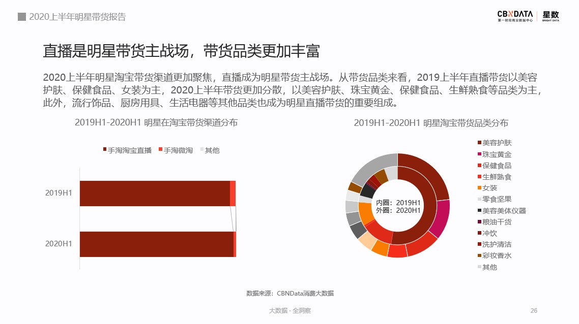 淘宝作为明星们首要选择的直播平台,如今已经拥有非常成熟的明星直播体系。CBNData星数《报告》显示,2020年上半年,直播已经占据明星淘宝带货渠道的98%。在品类方面也开始有了更多可能性,在直播中,你可以看到明星在淘宝上卖衣服,卖黄金甚至卖车卖房子。