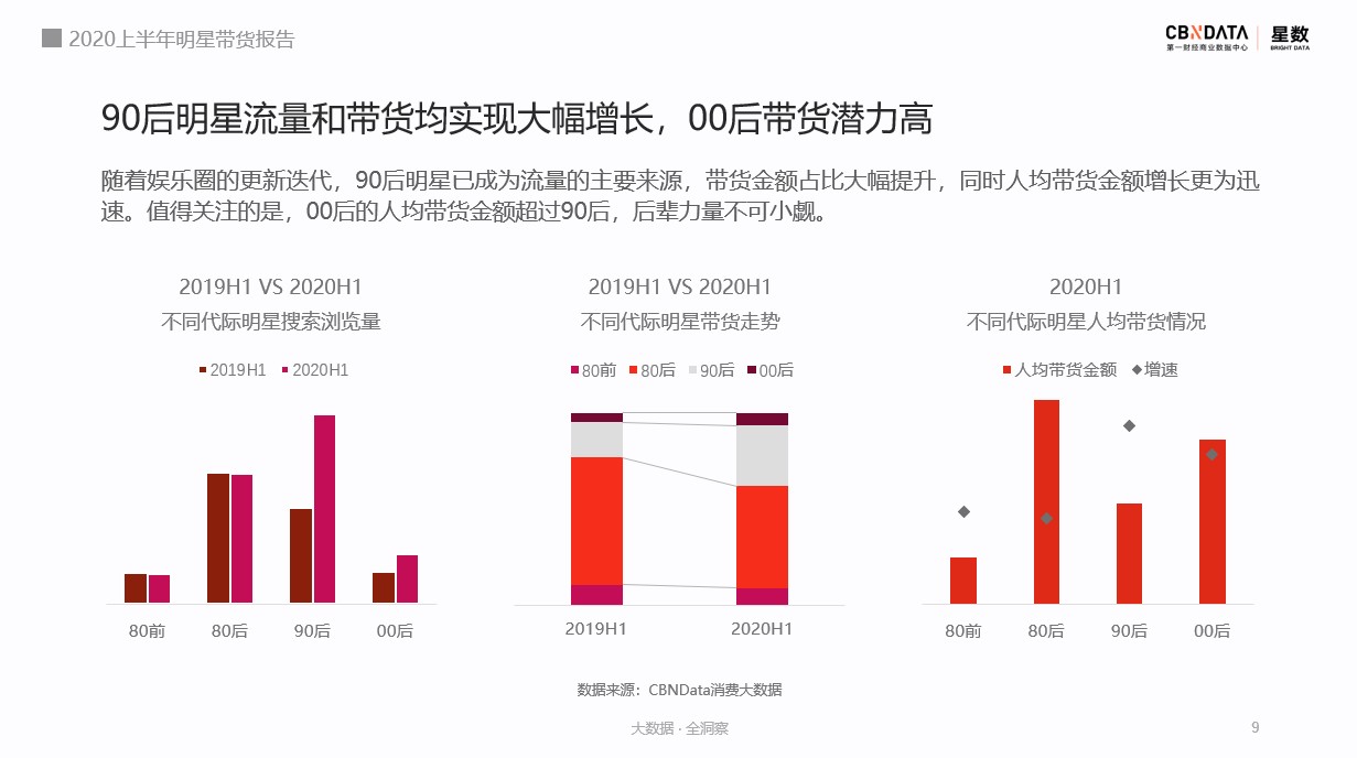 明星带货整体向着更加年轻化的方向进发,95后和00后明星成为影响消费的中坚力量,尤其是00后明星,大有反超前辈的趋势。今年上半年,00后明星的人均带货金额已经超过90后。这一数据也从侧面展现,品牌们开始把目光更多的投向年轻的00后明星,消费者也甘愿为此掏腰包买单。