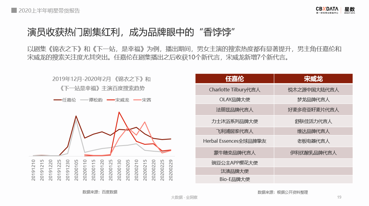 以任嘉伦和宋威龙为例,在主演剧集播出之后,一个收获了10个新代言,一个收获了7个新代言,代言资源的增长也推动两人的带货力在一季度快速上升,在CBNData星数明星消费影响力榜单排名前进300名以内。