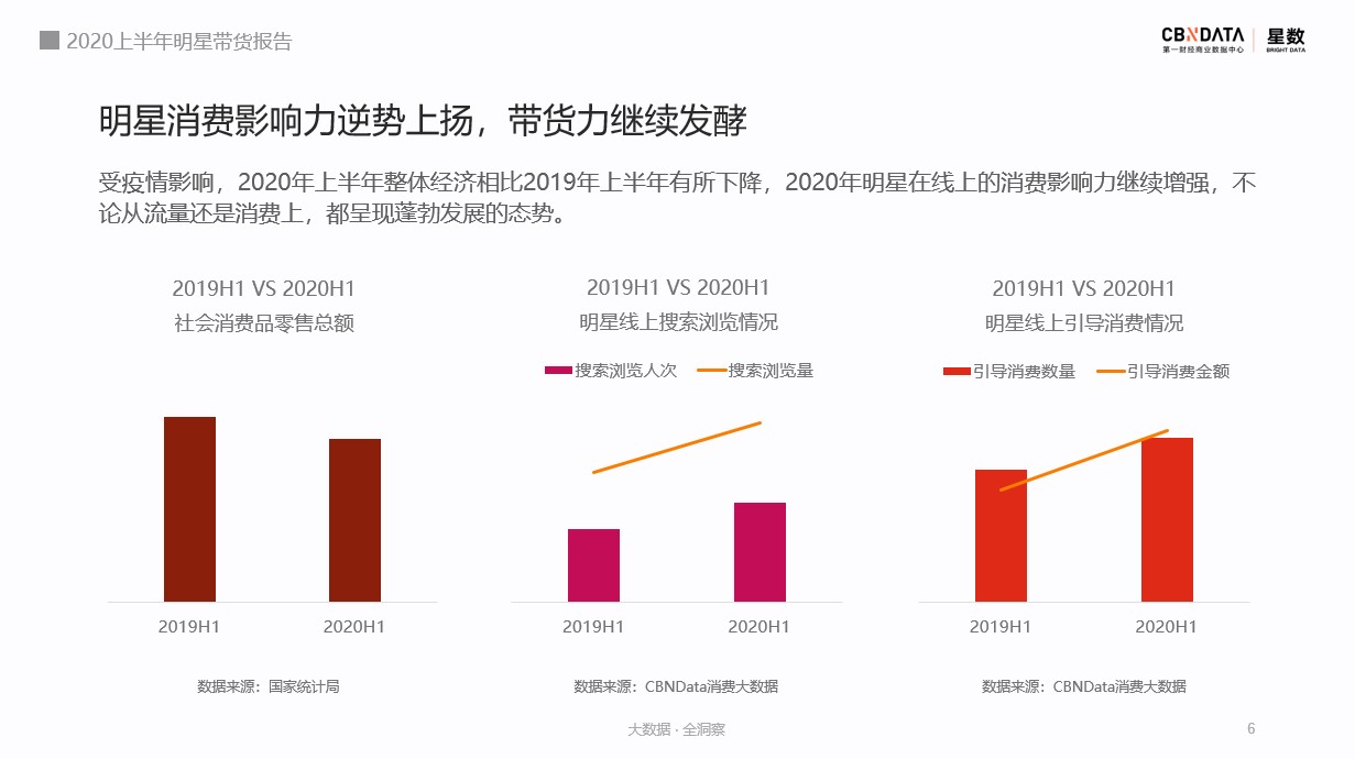 根据国家统计局统计,2020上半年,社会消费品零售总额较2019年上半年有所下滑。疫情的影响使线上消费成为了上半年最主要的消费渠道。在这样的大环境下,明星影响的线上消费市场还是一片向阳状态。CBNData星数《报告》显示,上半年,明星线上搜索量较去年同比增长37.6%,明星引导消费金额更是同比增长52.3%。