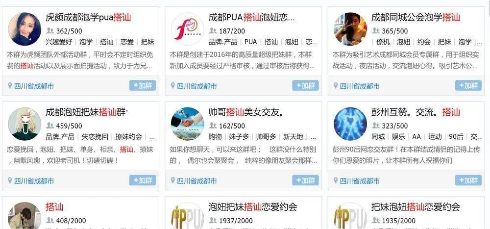 巅峰时期,只要打开QQ的“查找群”页面。只要搜索“搭讪”或者“PUA”这些关键词,就可以发现许多少则上限500多则上限2000、以泡妞、恋爱、“泡学”为标签、以美女为头像的活跃QQ群。