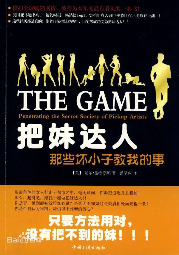 于是他根据自己的人生经历,撰写了一本名叫《Pick-up Artist》的书。后来进入中国市场时,因为译者是台湾人,又有了一个台味气息浓厚的中文译名叫“把妹达人”,也直观地点出了PUA的本质: