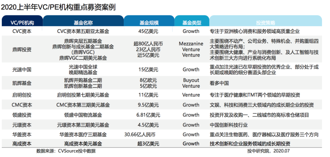 弹药是一切的根本。CVSource投中数据显示,当前,头部机构的募资总额已占全市场总规模的大部分版图,2018及2019年,该比例均超过50%。2020年上半年数据来看,CVC资本、鼎晖投资、光速中国、凯辉基金、启明创投等斩获巨额募资,最高达45亿美元。