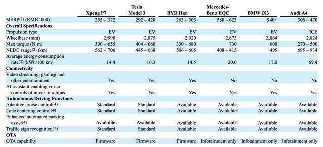 招股书中,小鹏也将P7与包括Model 3、比亚迪汉在内的多款新能源轿车做了详细地参数对比。其中,小鹏P7最大的竞争优势在于续航里程,其招股书提到,小鹏P7 706km的续航里程是国内市场中电动汽车能实现的最长续航里程。