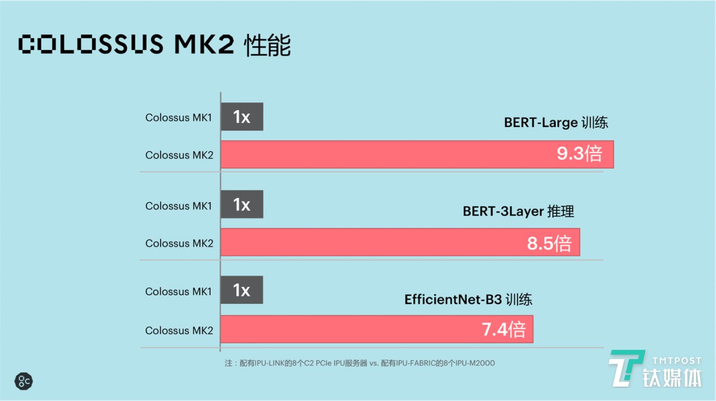 相比第一代IPU,实际性能提高了8倍,算力训练提升两倍。其中,BERT-Large的训练有9.3倍性能的提升,3层BERT推理有8.5倍的性能提升,EfficientNet-B3有7.4倍的性能提升。