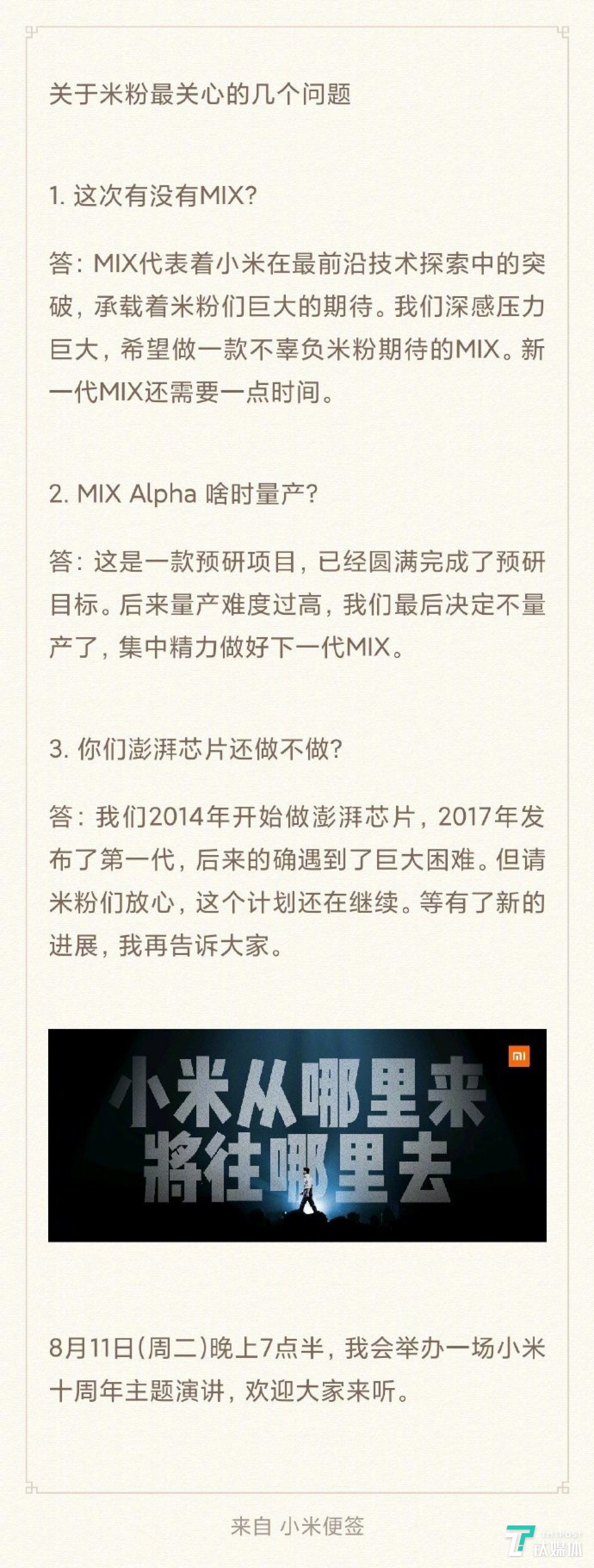 钛媒体注:昨日,雷军在微博回答了几个米粉们最关心的问题,内容包括这次有没有MIX、MIX Alpha啥时量产、你们澎湃芯片还做不做等。