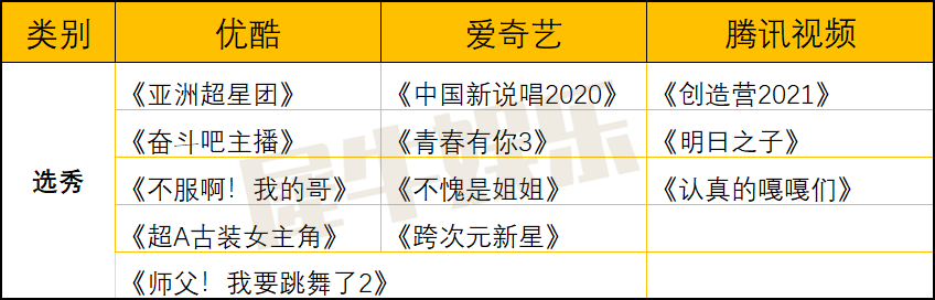 为“偶像帝国”添砖加瓦,依旧是三大平台的重要发力点。在综艺片单中,选秀类节目达到12档,爱奇艺的“老牌”选秀《中国新说唱》、《青春有你》,以及腾讯视频出品的《创造营》、《明日之子》,都赫然在列。优酷也在年度发布会中公布了2021年度首档S+级综艺《亚洲超星团》,在全球S级练习生中筛选强者中的强者。