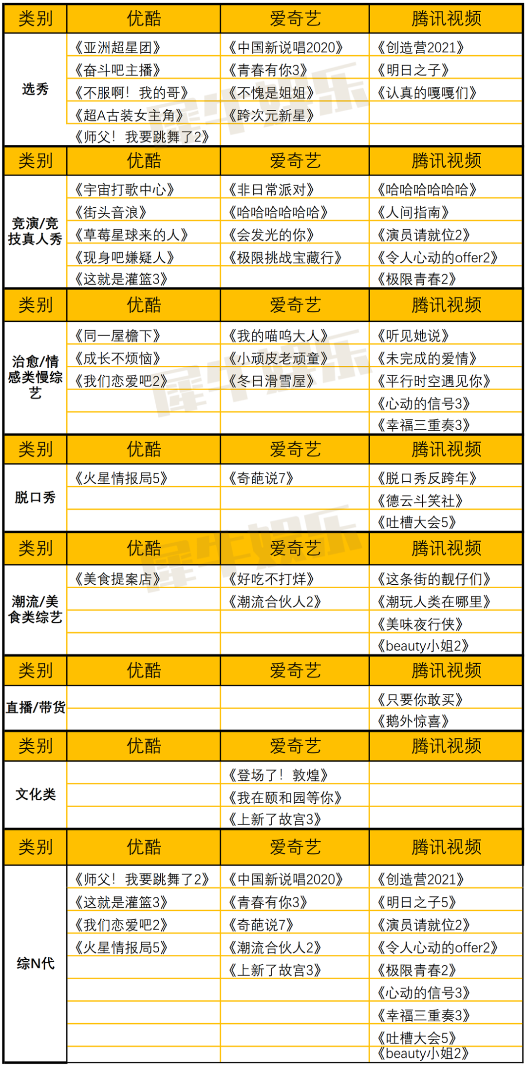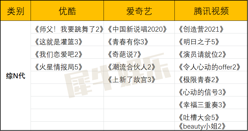 在三大平台公布的综艺片单中,综N代有18档,占据了片单的三分之一。在类别上,也做到了全面覆盖。《中国新说唱2020》、《青春有你3》、《创造营2021》、《明日之子5》,将造星选秀继续传承;《这就是灌篮3》、《演员请就位2》、《我们恋爱吧2》、《奇葩说7》、《上新了故宫3》……将竞技竞演类、情感类、脱口秀、文化等各类别综艺的生命力,都显露了出来。