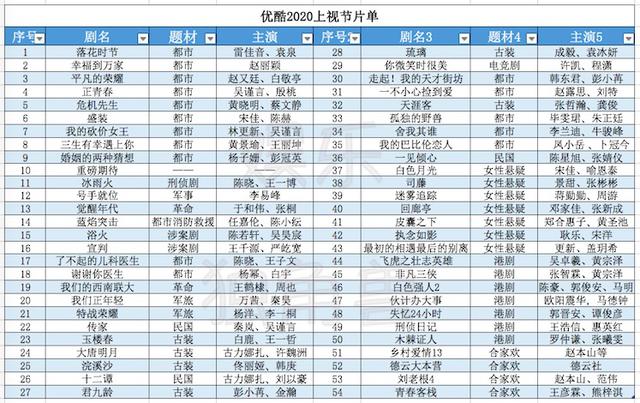 另一方面,“片单重任”完全交给了互联网平台。相较去年的22部片单,今年的腾讯视频大手笔发布了65部片单,主旋律、古装、都市、创新和IP系列应有尽有;这两年颇为低调的优酷也一口气发布了54部大剧片单,发力独播策略进一步凸显的同时,宠爱剧场、悬疑剧场等剧场概念愈发明确。