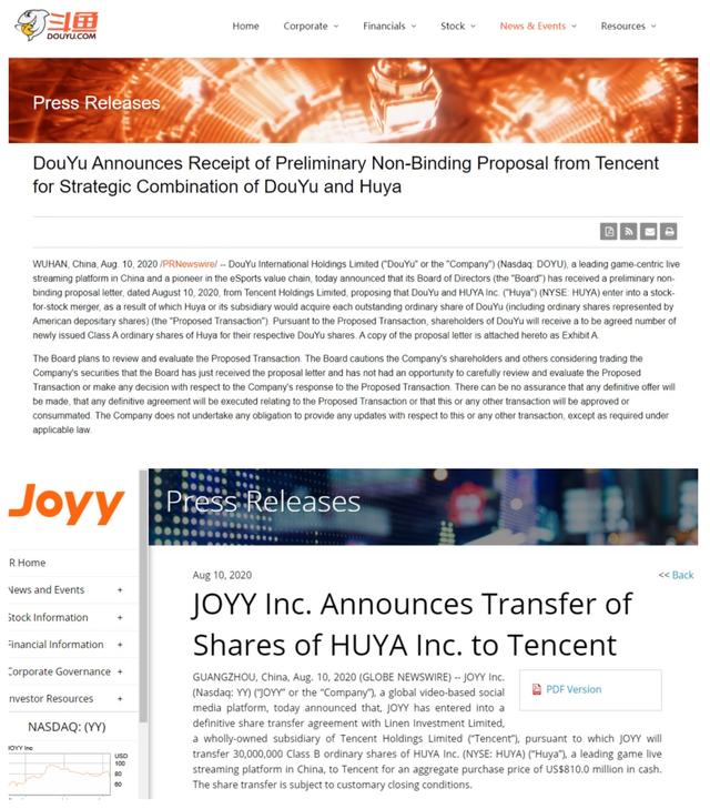 8月10日,斗鱼发布公告称公司董事会已收到腾讯控股于2020年8月10日发布的初步非约束性建议书,主要内容即建议斗鱼和虎牙订立换股合并协议。与此同时,欢聚集团也发布公告表示已与腾讯控股的全资子公司达成最终股份转让协议,公司将向腾讯转让虎牙3000万股普通股,总价值8.1亿美元。