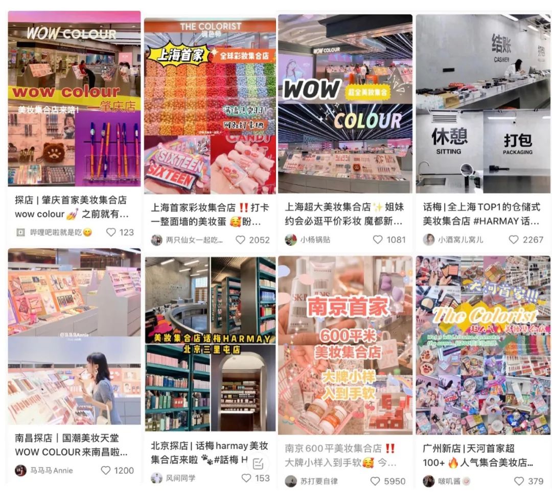 在小红书搜索“彩妆集合店”“调色师”“WOW COLOUR”等关键词,动辄就是上万条的笔记,“国货”“平价”“治愈”“少女心”“免费试到爽”“一站式体验”等词条频繁出现。买买买之余,拍照、分享、娱乐的体验,让潮人们欲罢不能。