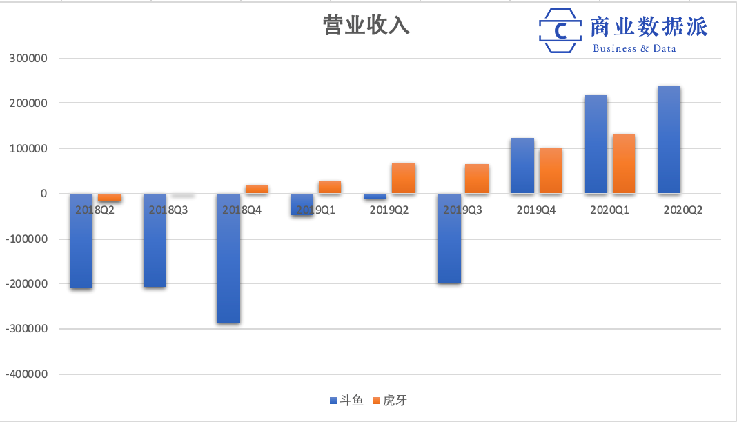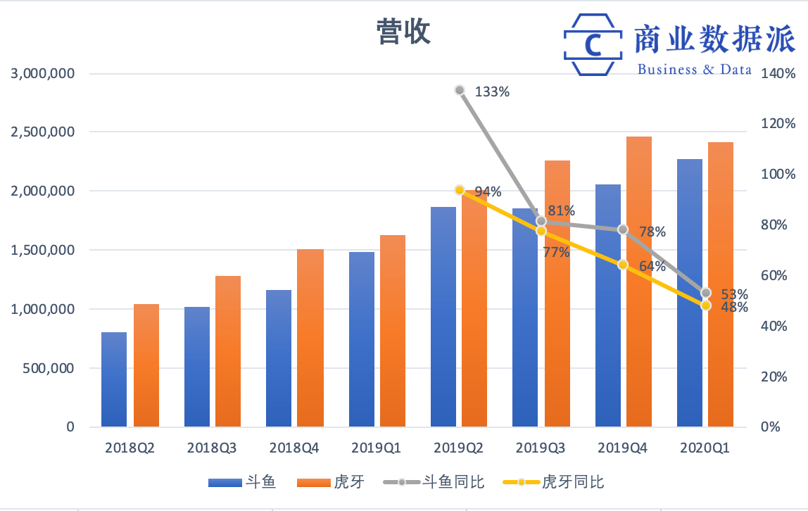 在短短一年内,斗鱼和虎牙营收的同比增速一直在快速下滑,斗鱼从2019年Q2的133%下降到2020年Q2的33.9%,而虎牙从2019年Q2的94%下降到2020年Q1的48%。