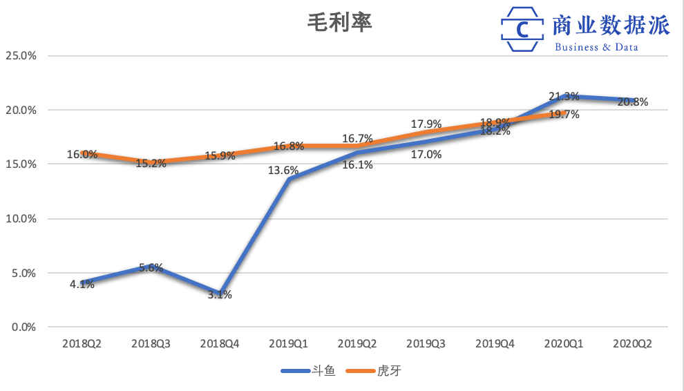 去除掉收入成本,斗鱼与虎牙的毛利率在近两个季度保持在20%左右,值得一提的是斗鱼的毛利率改善明显,2018年时只有3%~5%。