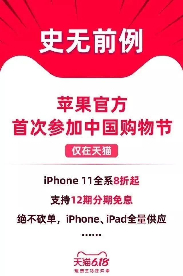 这是苹果宣布第一次以官方形式参与618折扣活动。在天猫iPhone11等全线产品支持跨店满减及提供150元会场优惠券,相当于全场8折起,最高降价幅度达1830元。