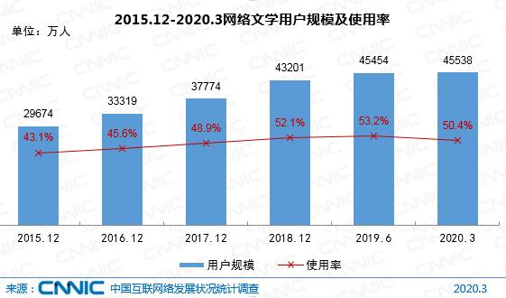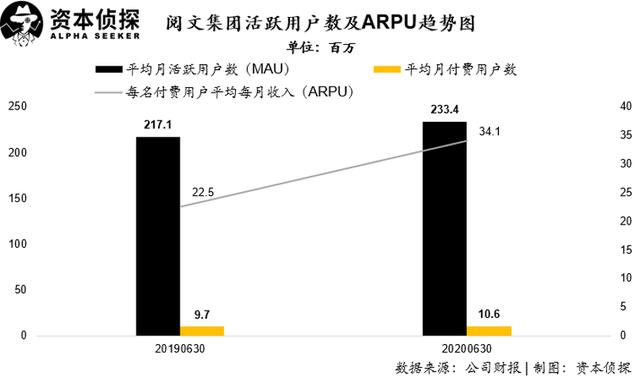 2020年上半年,阅文集团自有平台产品及自营渠道的平均月活跃用户数(MAU)为2.33亿,同比增长7.5%;月平均付费用户数达到1060万,同比增长9.3%;每名付费用户月均收入(ARPU)为34.1元,同比上涨51.6%。