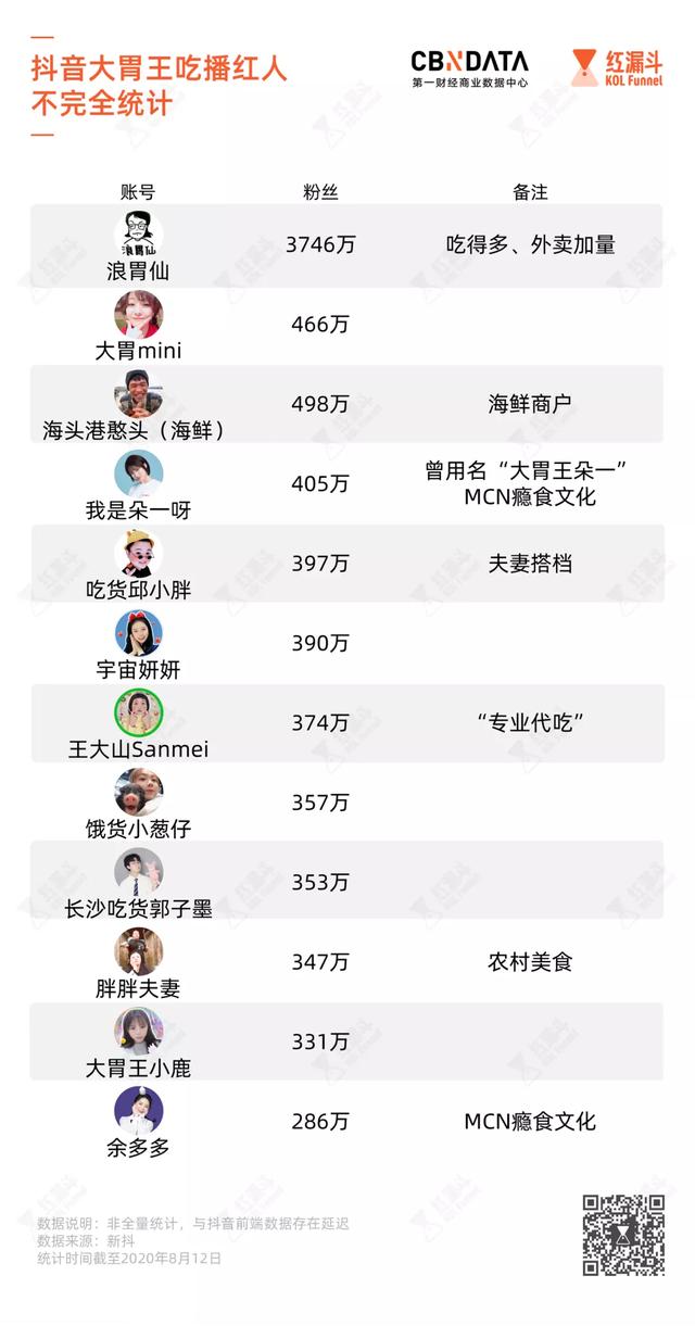 通过在美食垂类对粉丝量排序,并综合”吃播“关键词进行搜索,我们罗列了一份抖音“大胃王吃播”红人列表。
