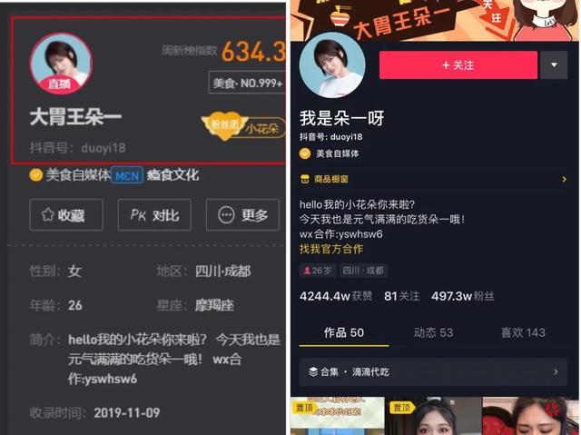 MCN瘾食文化下的“大胃王朵一”改名为“我是朵一呀”,因为第三方平台新抖的数据更新延迟,她在新抖的账号名称还是大胃王朵一。图表中的另一位大胃王吃播红人余多多同样属于这家MCN旗下。