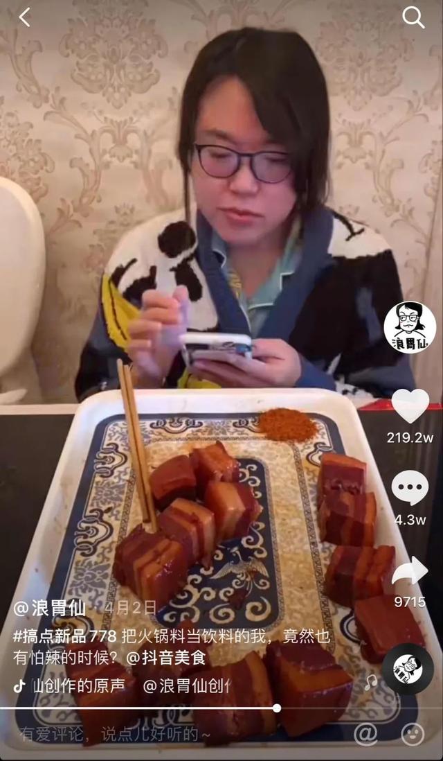 被粉丝称为浪老师的红人浪胃仙以近4000万粉丝数量排名榜首,他以“点外卖加料”的吃播视频闻名,比如一盒米饭加50份红烧肉、一杯奶茶加100份波波。