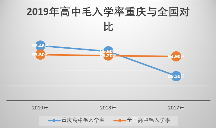 2017-2019年,重庆初中、高中毛入学率均高于全国水平,普通高校实际录取率在90%左右,也超出全国高考总录取率,值得注意的是,2019年全国高考总录取率下降的情况下,重庆高考实际录取率仍保持增长势头,高出全国10.57%。