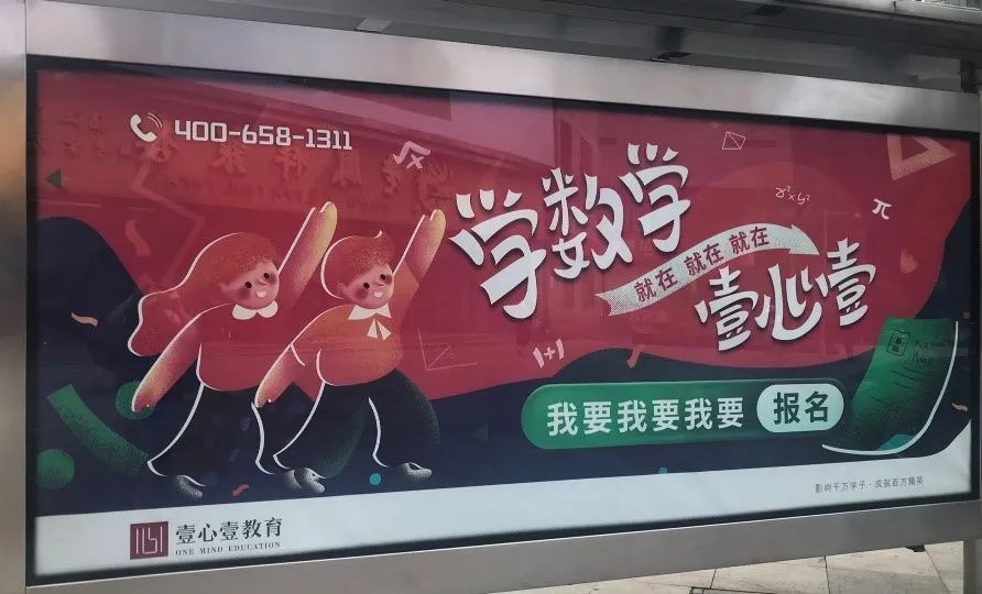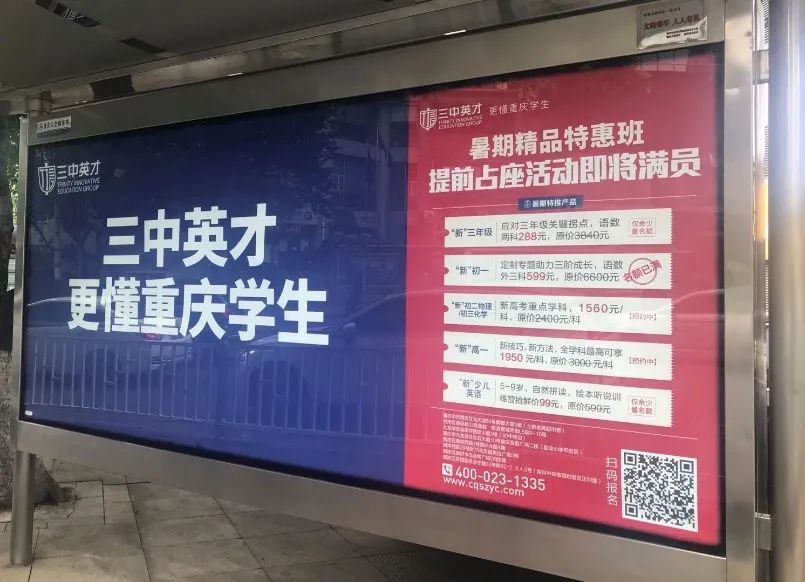 当外来机构入驻重庆之后,必不可少的是将地面广告铺开,对家长形成广告效应,像公交站牌、灯箱、楼宇电梯、轻轨等都能看到它们的广告。