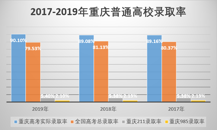 2019年,重庆高考录取率为90.1%,尽管高出全国总录取率10.57%,但一本录取率仅为13%,比2018年下降2.8%,且211录取率仅为5%,985录取率只有2%,在重庆,上大学容易,上好大学却很难。