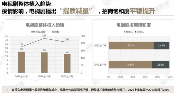 与之对应的,是面临疫情侵袭,上半年剧集植入品牌整体数量同样有所下降,但也隐藏着一种逆风爆发的趋势。击壤数据显示,虽然上半年208个品牌植入较之去年的235有所下降,有植入的电视剧也减少了2部,但招商饱和度却达到74.2%,意思是今年播出电视剧中74.2%均有植入,而去年同期这一数据为71.4%。