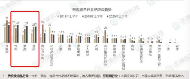 击壤数据显示,今年上半年电视剧中只有饮料、酒类、食品等传统快消品较之前两年有所增长,基本维持在26-28个品牌左右;互联网行业和娱乐产业则是在经历了去年大幅度飙升之后,今年出现了明显回落,但整体品牌数量仍然比较可观;其他增长或持平的行业有家居、个人用品、邮电通讯、数码办公。