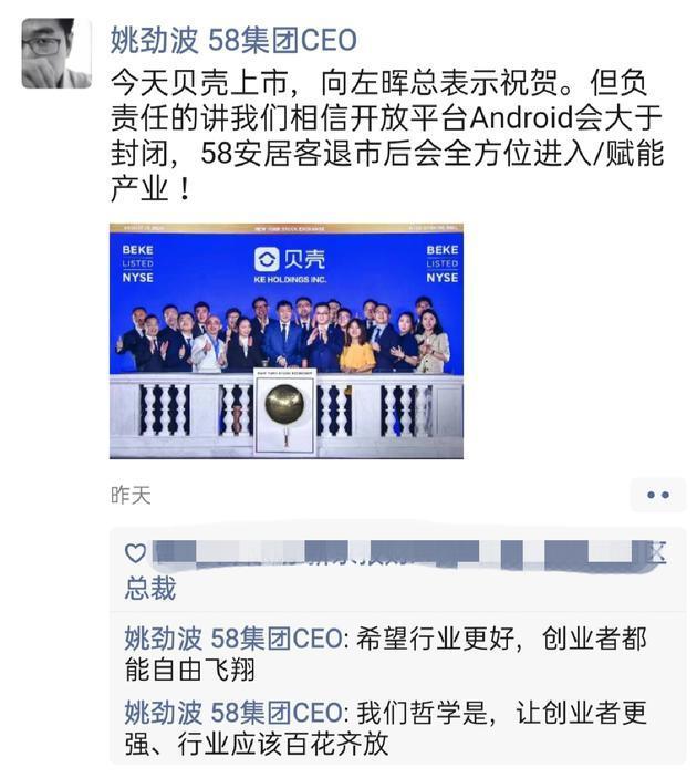 有意思的是,尽管一直将贝壳视作眼中钉,“逢贝壳必反”的姚劲波在贝壳上市后,发了一条耐人寻味的朋友圈。
