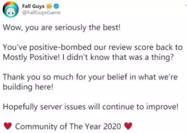 而后看到欧美地区好评率上升,又在社交网络上称赞“好评轰炸”,并表示“希望服务器质量能越来越好”。