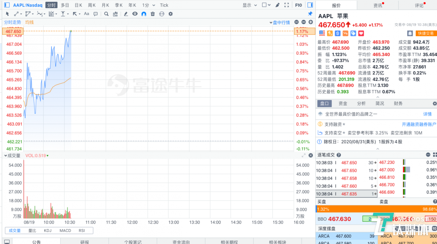 数据显示,自年初至今,苹果公司股价上涨了59.24%,在过去的一年中,该股最高达到468.65美元/股,最低为201.00美元/股,累涨122.3%。