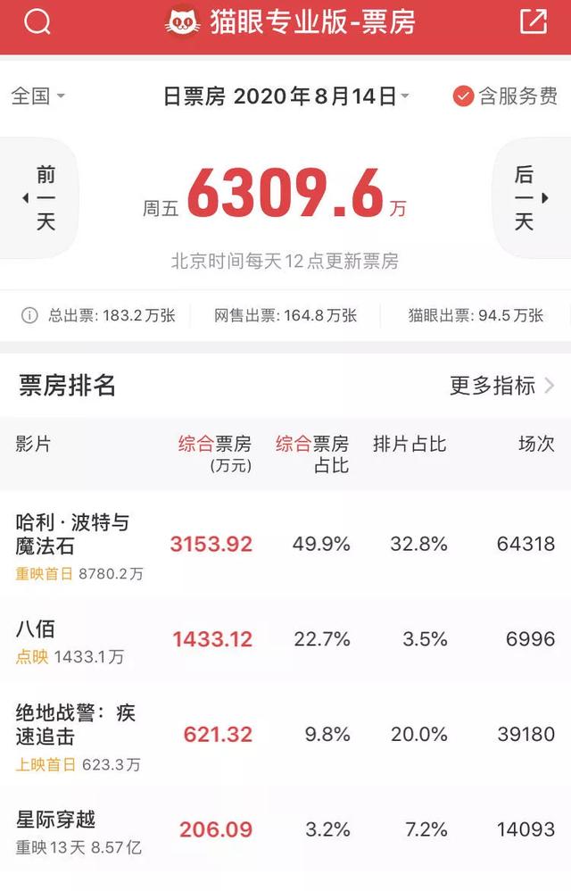8月14日,《八佰》正式开启点映。根据猫眼数据,《八佰》以3.5%的排片占比、33.5%的上座率,换回了1433万票房。虽然票房上被同日重映的经典老片《哈利·波特与魔法石》(以下简称《哈利·波特》)领先,但是超过了同期上映的新片《绝地战警:疾速追击》(以下简称《绝地战警》)。