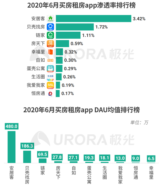 至今,我们看到安居客及背后的58同城在房产信息服务上仍然占有流量优势。根据极光大数据发布的相关数据显示,2020年6月贝壳找房App的渗透率为1.72%,安居客为3.42%;另一方面,安居客平均DAU为480万,贝壳找房平均DAU仅为186.3万,链家则是69.5万。从当前数据来看,上线两年多的贝壳找房在C端确实还无法动摇安居客。
