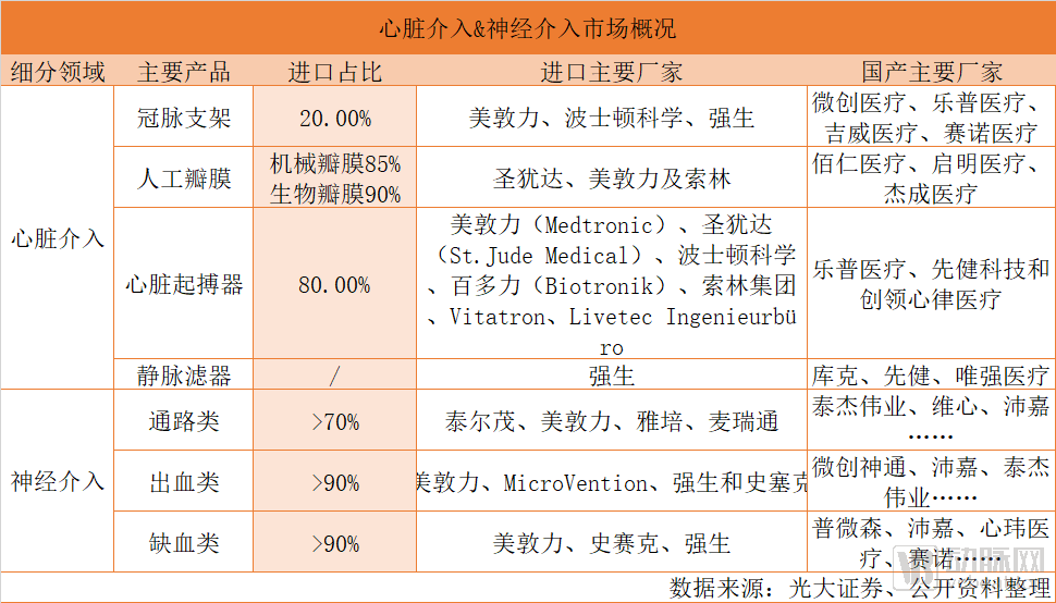 在壁垒较低的通路类产品中,国产化进程较快,包括微创医疗、沛嘉医疗、泰杰伟业等企业都已能实现通路类产品的自主研发生产,通路类产品的进口占比约在70%,相比于出血类和缺血类产品进口占比高达90%以上,通路类产品已经实现部分国产化。