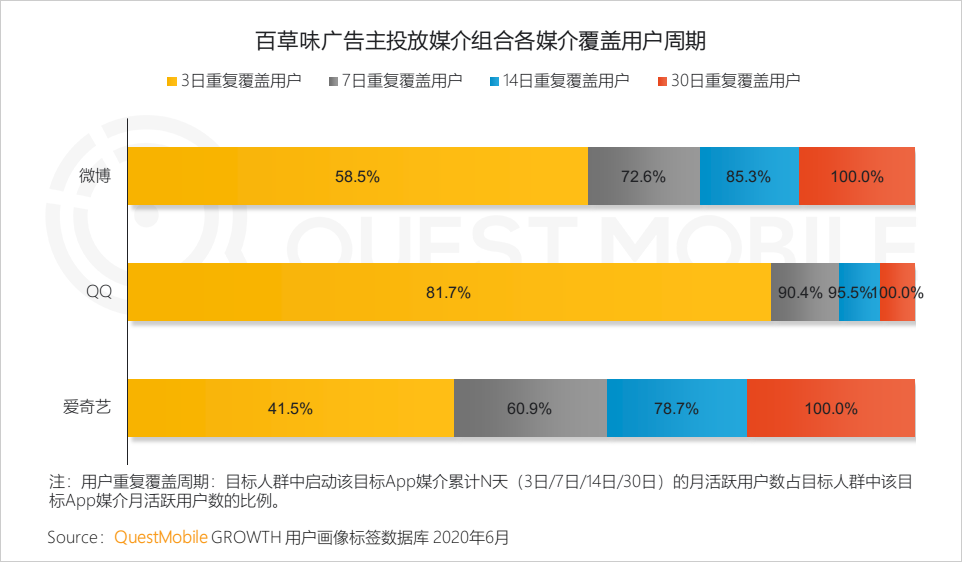 选取微博、QQ、爱奇艺为例进行媒介投放,可覆盖目标百草味受众群体87.7%,其中QQ对百草味受众群体覆盖效率更快。