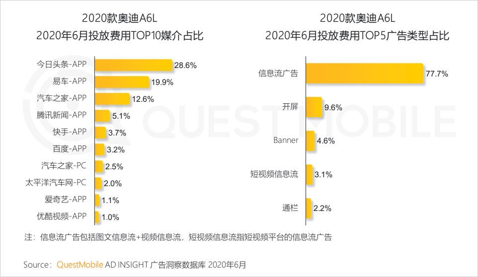 以2020款奥迪A6L为例,广告投放媒介主要有今日头条、易车、汽车之家等。