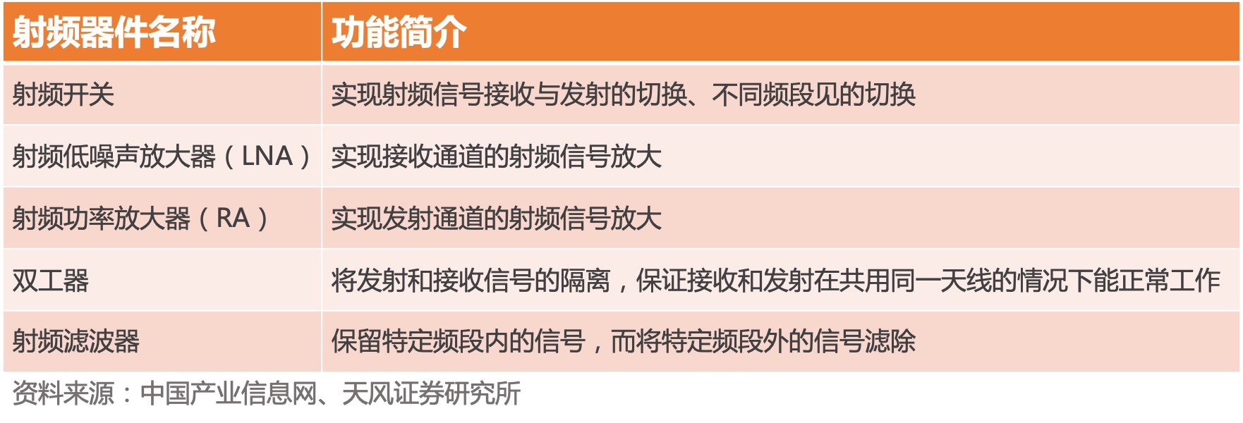 滤波、功放、高精度数模转换等核心芯片,决定了基站能处理无线信号的频段、无线信号中通信信号的处理能力和噪声信号的抑制能力,基站的负荷能力等性能。射频器件的具体功能介绍如下: