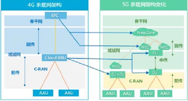 以基站端的传输网为例,5G网络架构相对4G网络架构增加了很多光纤线路,原有4G网络中基站侧的AAU光纤拉到BBU,BBU光纤直连核心网则完成组网,而5G网络中将BBU的功能分解成了实时性要求高的DU单元和实时性要求不高的CU单元。因此除了基站建设带来的5G AAU及5G带宽增长导致的光纤链路的自然增加,还另外新增了AAU和DU、CU之间前传和中传的物理链路,这些均由光模块和光纤及施工管路组成,从而构成新的经济增长点和价值放大空间。