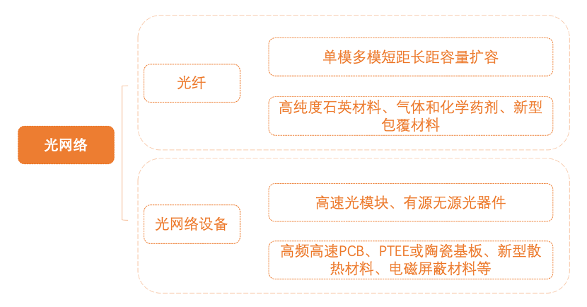 5G通讯各部分元器件准备就绪后,需要通过承载网进行勾连和传输,那么5G新基建中的传输光网络建设会带来光传输设备、光模块和光纤建设数量的成倍增长。