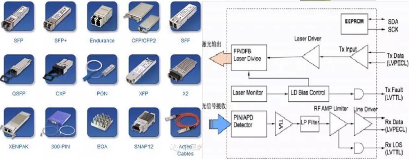 左图为各类光模块的不同形态,右图为光模块内部结构