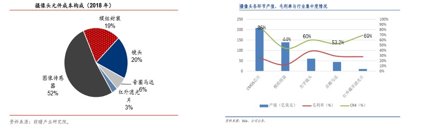 CIS在摄像头元件中的成本占比达到52%,同时行业集中度高,CR4指标达到了86%;光学镜头的情况与之类似,成本较高且行业集中度较高。因此,我们重点关注在CIS芯片和光学镜头这两个毛利率较高的领域中的龙头企业。