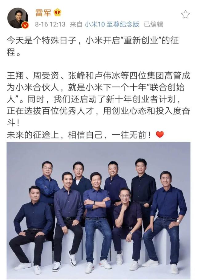 8月16日,雷军发布全员公开信,宣布小米将实行合伙人计划和“新十年创业者计划”。