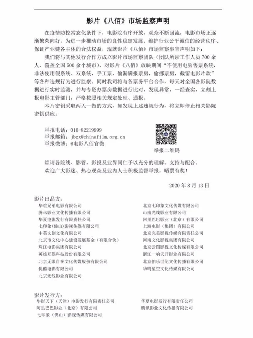 据悉,为了规避偷漏票房行为,除了点映阶段采取的分阶段密钥和保底分账发行模式外,此次《八佰》的发行部门还专门成立了市场监察小组。