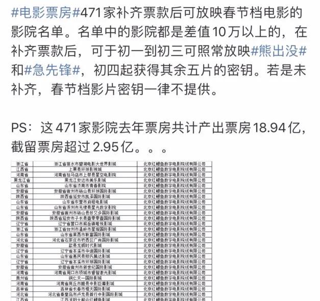 自《电影产业促进法》颁布以来,国家电影局每年都会不定期点名公示偷漏票房行为的影院名单。今年1月,电影局点名去年拖欠票款超过10万元的471家影院,若不及时补齐票款,将无法放映所有的春节档电影。此次《八佰》,同样表态将这部分影院拒之门外。